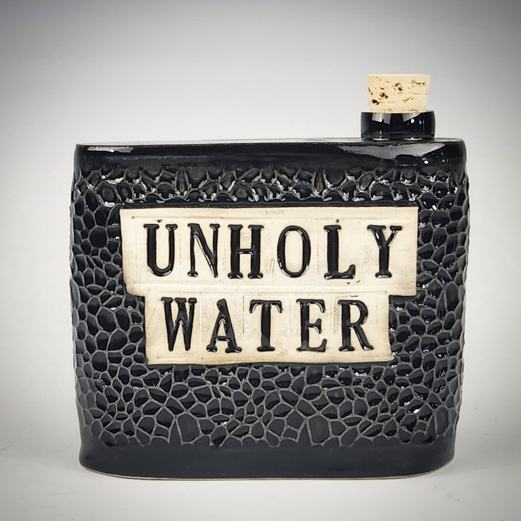 Handmade porcelain textured flask with hand pressed text and glossy black glaze. Comes with cork stopper